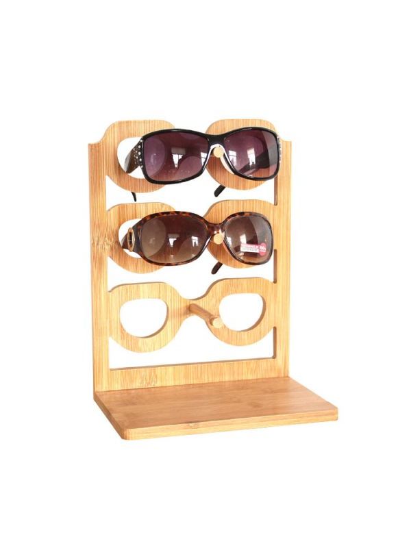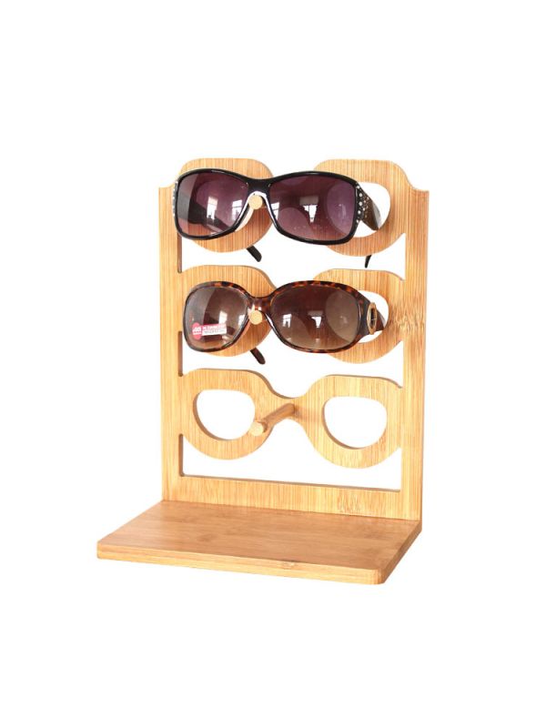 This strong and durable Bamboo wood display stand can fit up to three pairs of sunglasses or eyeglasses.